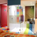 Cada espacio de la habitación, además de dar una solución funcional se presenta al usuario como un ambiente lúdico. Es así como elementos necesarios y básicos como la cama, la regadera o la mesa se convierten en piezas del juego que se complementan el diseño, como las figuras geométricas a los pies de la cama. Todo el concepto tiene una paleta de 3 colores vivos como base. Estos son el verde, el naranja y el rojo que están aplicados en el tapizado de muebles, plafones y muros de forma aleatoria generando así un patrón de combinaciones distinta para cada habitación, con la idea de que se perciban diferentes espacios. A esta aventurada combinación de colores y proporciones se suma también la variable de los 3 diferentes fotomurales.