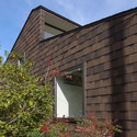 El muro exterior ha adoptado el mismo revestimiento de los techos de tejas existentes. Esto resiste bien la nieve y apunta a un patrón como icono de una zona residencial actualmente confusa.