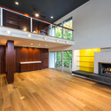 Un activo importante para el proyecto fue el diseño y construcción con la colaboración de Rhino Construction Inc, lo que permitió la flexibilidad y la modificación durante el proceso de construcción como la historia de la casa que comenzó a revelarse cuando abrimos las paredes y los pisos. La capacidad de adaptarse a los nuevos descubrimientos, manteniendo un compromiso con el alto nivel de la artesanía que el hogar se merecía, se convirtió en indispensable. Cuando comenzamos a pelar las capas traseras del edificio existente durante la construcción, descubrimos que el techo del espacio principal tenía un rico tono azul-gris, que era simplemente pintar encima de blanco. Con el descubrimiento de más elementos, se determinó que el arquitecto original extendió este techo de color en la sala de estar para los plafones en los exteriores, creando un efecto de interior y exterior al estar de pie en el espacio.
