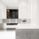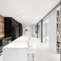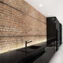 Tono sobre tono, los muebles negro brillante de la cocina se mezclan con los aparatos eléctricos. La cubierta de la cocina permite la máxima exposición de la pared de ladrillo, iluminada por un diodo emisor de luz empotrada en el mueble. La mesa del comedor se convierte en la continuidad visual de la isla de la cocina. En el baño, la cubierta de acero inoxidable y las formas rectilíneas se apilan unas sobre otras, formando una composición escultórica. En el suelo, el epoxi blanco y en la ducha un epoxi gris oscuro. El contraste entre estos dos colores forman una frontera psicológica de dos áreas: una es clara y brillante, la otra más oscura, creando un área privada para la ducha y el inodoro. La ventana permite que la luz natural entre en la habitación, preservando la intimidad del espacio con una película mate .