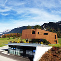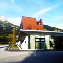 Por lo tanto, el proyecto se divide en dos volúmenes que se comunican - la parte inferior situada frente a la calle se utiliza para fines de trabajo, mientras que la parte superior ofrece espacio para una sala de estar de 2 plantas. Ambos volúmenes se combinan con una superficie común que sirve al mismo tiempo como un techo para las salas de ensayo y una terraza / jardín de uso privado. La extensión de los tramos de superficie y techos de toda la cara oeste del edificio se convierten en un garage en la parte norte del edificio. Este concepto asegura la independencia de las funciones en un edificio integrador, creando un gran jardín con vistas panorámicas hacia las montañas de los alrededores y una visión mínima desde la calle.