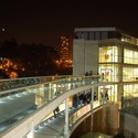 Tanto el acceso como su fachada principal, se orientan hacia la pendiente del terreno, hacia el interior, y es través de la construcción de 2 puentes que se conectan la biblioteca y el casino (ubicados en los pisos cuarto y quinto respectivamente ) con los jardines y espacios exteriores.