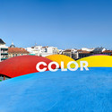 Las cúpulas. se ha cambiado el color de cada una de las cúpulas modificando el paisaje de la zona de una forma contundente. Los colores nos hablan del optimismo, y, de alguna manera, exteriorizan lo que pasa dentro del Mercado. Desde lo alto de una de ellas, la azul, en un punto concreto, puede leerse la palabra COLOR escrita en blanco sobre las otras cúpulas. Al equipo les parecía bonito dejar una sorpresa en la cubierta. La técnica que han utilizado, el anamorfismo, modifica la perspectiva “aplanando” el espacio.