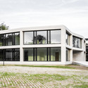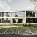 Descripción enviada por el equipo del proyecto. El edificio fue concebido con la preocupación de crear un diálogo con el edificio colindante, también encargado por el mismo cliente. Esto se expresa principalmente por la geometría de los volúmenes, cuyas fachadas plisadas refuerzan su contraste con la naturaleza, por medio de la utilización de hormigón, vidrio y metal como materiales principales de construcción.