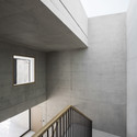 Uno entra en el edificio a través de una entrada generosa que conduce a una sala central bañada de luz cenital natural. La sala se despliega verticalmente en forma de cascada con una escalera que conduce al primer piso.