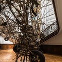 Instalación interactiva que fusiona materiales orgánicos y basura electrónica.