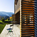 Descripción enviada por el equipo del proyecto. La 'Casa Simple' es un proyecto pensado para una pequeña familia unifamiliar en la pintoresca zona de Kropa, Eslovenia. La forma básica de la casa es arquetípica; un volumen limpio de techo inclinado, mientras el tamaño y proporciones de la casa se relacionan con las viejas granjas de los alrededores. Este volumen limpio, abstraído de lo tradicional, está envuelto por una cubierta contemporánea que resguarda las ventanas y las logias creando una apariencia exterior anónima y libre de ventanas. El recubrimiento fue logrado a través de la implementación de un patrón hecho de líneas horizontales como persianas que cubren los lados norte y sur, mientras que líneas verticales de acero toman su lugar desde el segundo nivel y hasta unirse con el techo. Las persianas al norte y sur funcionan como un velo, protegiendo la privacidad de la familia al impedir que extraños miren al interior pero, al mismo tiempo, permitiendo las vistas desde el interior y hacia el paisaje que contiene el sitio. Las persianas pueden abrirse o cerrarse dependiendo del clima y el humor de los ocupantes.