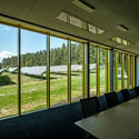 Descripción enviada por el equipo del proyecto. El anexo de aspecto sencillo para el Centro de Control de Red de Media Tensión proporciona el espacio adicional necesario para acomodar el cambio a fuentes de energía renovables - usted no se imaginaría que es una construcción de madera.