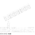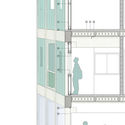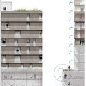 El edificio se recompone con viviendas en los pisos superiores. El aterrazamiento del edificio genera grandes espacios privados de usos colectivos. La diversidad tipológica consigue diversidad de usuarios y se traduce en la piel como tratamiento arquitectónico.