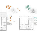 Así, las viviendas se configuran a partir de un NÚCLEO (subestructura independiente con caños de acero estructural) que alberga las áreas de servicio y guardado, y sirve de soporte a entrepisos (de alturas variables) que constituyen el espacio habitable. Esto permite: facilitar obras sanitarias de mantenimiento; liberar el espacio habitable; y posibilitar infinitas configuraciones tipológicas según las distintas disposiciones de los entrepisos. La superficie mínima es de 36m2 pudiendo llegar hasta 126 m2. El sistema tecnológico es liviano y abierto por vía seca, elegido por su bajo costo de instalación, cortos tiempos de obra y gran durabilidad, lo que resulta conveniente para estas viviendas sociales accesibles.