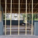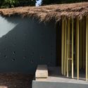 La elección de los materiales se basa en la observación de los diversos sistemas de construcción locales, eficiencia de los recursos, durabilidad y uso del conocimiento empírico local. Las opciones constructivas resuelven y previenen problemas como el sobrecalentamiento o las inundaciones, la invasión de termitas y la degradación causada por el uso y las características climáticas fuertes. Utilizamos una estructura mixta de perfiles de hierro y madera, lo que limita el espacio y sostiene una cubierta de paja.