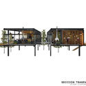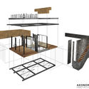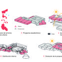 Por medio de una estructura compuesta de vigas y columnas de acero a manera de nave industrial, va desarrollando distintos esquemas espaciales para albergar actividades diversas de manera que se relacionen entre sí, y a su vez, con el tejido urbano y el espacio público que se delega a la zona más pública del predio y se mantiene abierto para el usuario.