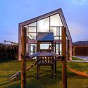 Descripción de los arquitectos: el proyecto explora la forma esencial de la cabaña buscando expresar un solo espacio que en realidad son dos completamente diferentes en forma, textura y espacialidad. El primer piso es ortogonal, blanco y neutro, es un taller de pintura, cerámica y música donde el protagonista es el trabajo de los niños. El segundo es un espacio en el que la forma de la cubierta inclinada y asimétrica conforma las paredes interiores que están enchapadas en madera y permiten una calidez especial para la lectura y el trabajo con el cuerpo. En el segundo piso, una ventana corrida enmarca la línea de la montaña y los dos frentes de fachada transparentes buscan integrar la naturaleza y hacerla parte del espacio interior.