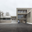 El diseño rítmico de las fachadas verticales de madera rompe el gran volumen del complejo y permite la transparencia en los espacios interiores. El revestimiento gris pre-degradado crea un diálogo con la ya existente escuela secundaria "Realschule". Como parte de un complejo escolar, formado por un jardín de infantes y una escuela secundaria, se creó una ampliación del vestíbulo principal para conectar la "Realschule" a la sala de deportes.
