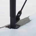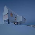 La tipología de pilotes eleva la casa por encima de la línea de árboles circundante, dándole una vista ininterrumpida del Mont Saint Anne desde la sala de estar, así como una sorprendente estética general. También permite que la luz del sol entre directamente en la casa a todas horas del día. Las líneas limpias y nítidas de los volúmenes se consiguen mediante el uso de revestimientos de paneles de hormigón blanco y paneles de techo de acero corrugado. En un día nublado y nevado, la casa se mezcla con el paisaje blanco casi desapareciendo, y en los veranos la mínima estructura blanca corta una forma clara contra las verdes colinas circundantes.