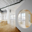Un único elemento estructura el espacio. Un gran cubo arquitectónico blanco que alberga la sala de reuniones, el único espacio cerrado de la gran sala, separa la zona de trabajo de la zona de dirección.