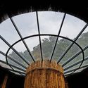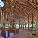 El segundo piso es un área de recepción para los visitantes que combina el área de refrigerio y restaurante, con pilares de hormigón armado combinado con bambú nulgar y un sistema de marco de acero reforzado.