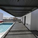 Revestimientos de hormigón: Los revestimientos de hormigón caracterizan este edificio. De fácil mantenimiento, estas superficies se construyen en la casa en referencia a la arquitectura tradicional de las Cícladas, donde los muebles forman parte de la estructura de la casa. Estas superficies fueron tratadas en alto contraste para exceder su naturaleza poética, rural y "primitiva".