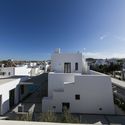 Es una casa para una familia de músicos donde los volúmenes blancos son estructurales y siguen siendo simples y cúbicos; siguen los vacíos y las masas de los edificios vecinos, proliferan desde las vistas hacia el mar y se asimilan al contexto. El microcosmos de la casa evoluciona alrededor de la piscina y el patio interior "protegido". El espacio exterior fluye como una espiral desde el patio de la planta baja a la terraza superior, que tiene una magnífica vista al mar y al pueblo de Naousa. Al lado de la piscina, el estudio de música, también sirve como habitación de invitados. Los materiales utilizados son simples y minimalistas: pisos y techos de hormigón, marcos de metal gris oscuro y las paredes de color blanco brillante de las Cícladas.