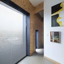 Los espacios de dormitorio, estudio y baño abrazan los bordes de la parte más baja del plano y la entrada. La circulación y las áreas de estar principales, protegidas unas de otras por paredes bajas, completan el resto del plan de dos niveles. Esto crea un espacio fluido y abierto, cuya parte más profunda está iluminada por charcos de luz. El umbral entre los niveles inferior y superior se define por una composición de elementos: escalera, muro de bloques, columna de madera y viga laminada "kerto".