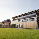 El elemento característico del edificio es la construcción de madera laminada con elementos guiados en diagonal y cortes en los bordes del techo. Ha sido expuesto no solo al exterior, sino que también penetra en el interior del edificio. En la conexión de las dos pendientes del techo hay ventanas que dejan entrar una porción significativa de luz. Las ventanas se montan muy por encima de la planta baja y cuando se abren logran una ventilación natural que funciona de manera muy eficiente.