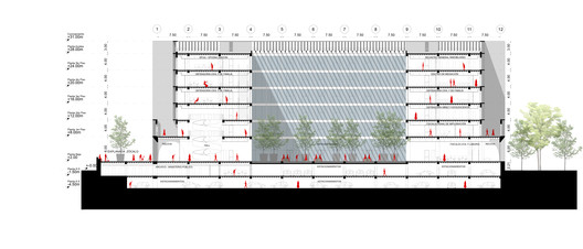 La apertura de los espacios hacia la comunidad, considerando a la Plaza Institucional como articuladora de todas las actividades (...) Se propone la idea del edificio como configurador de la plaza a partir de acentuar el plano horizontal que conforma el límite del basamento del edificio propuesto, dando mayor transparencia a nivel urbano produciendo la integración entre espacio interior – exterior. El mismo también marca en el edificio el desarrollo de las actividades de lo más público a lo privado.