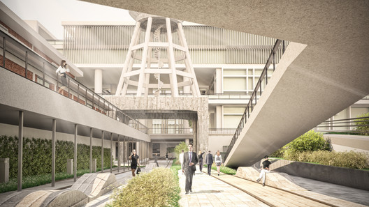 La idea generadora del conjunto parte de materializar dos ejes peatonales distintos y bien diferenciados: por un lado un eje institucional, dinámico, dónde se emplazan todas las funciones urbanas de accesibilidad al predio, y, por el otro lado, un eje patrimonial, estático, que vincula a nivel peatonal, el edificio de la antigua Bodega, el tanque de agua y los silos, pertenecientes a la historia del terreno y de la ciudad. (...) Se proponen estos dos ejes de circulación, con la intención de enlazar la historia de la bodega y su importancia para la provincia, con el futuro de la Ciudad Judicial junto a las nuevas actividades a desarrollar en el sitio.