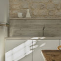El nivel inferior, que contiene una cocina, un baño, una sala de estar y el dormitorio de los niños, es una mezcla de espacios de una y dos alturas, definidos por muros de hormigón de cara a cara y muros de piedra existentes.