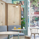 Ocupando un espacio en la esquina con grandes ventanas que se extienden a través de las paredes que dan a la calle y un escaparate abierto con paneles plegados en ambos lados, el comedor se convierte en una extensión de la bulliciosa vida en la calle. Inundado de luz natural, este espacio frontal alberga dos mesas comunales en el centro, mientras que la banqueta de abedul está tapizada con líneas de cuero gris claro en la pared posterior, acompañadas de mesas de mármol blanco sobre bases de color verde menta en toda la habitación.