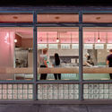 Más allá de la barra hay un mostrador de azulejos donde se pide y prepara la comida. Un corredor a la izquierda conecta varios nichos en la pared de ladrillo pintada de blanco para exhibición. Un letrero de neón de color rosa claro se ilumina cuando los invitados se alinean en orden, agregando un tinte de contraste a la paleta de colores. El pasillo termina en la sala de atrás con un comedor más pequeño y tranquilo que alberga obras de arte en las paredes.