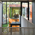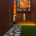 Volumétricamente simple desde el exterior, listones verticales de Ipe cubren un conjunto apilado de tubos que están abiertos a las vistas del lago y el bosque, pero visualmente cerrados a los vecinos. Formamos los tubos espaciales de la casa alrededor de los ejes de visión que atraviesan el sitio, uniendo perceptualmente el lago a través del bosque con los campos más allá. Estos tubos de encuadre son vacíos literales en la masa de la casa delimitados en sus extremos solo por vidrio. La luz y el aire también ingresan a estas habitaciones a través de ventanas operables ubicadas detrás del revestimiento de madera. Los densos espacios de servicio ("sólidos de programa") llenan el volumen restante.