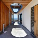 Dispusimos un techo en ambos e hicimos un patio como un "espacio libre" en el medio. El techo sobre este patio está ahuecado en una forma elíptica, y los pies están conectados a la cubierta que conduce al mar. El la estructura del taller es de un piso, mientras que la casa es de dos pisos. El techo del taller es una terraza cubierta de madera, que tiene conexiones con el espacio exterior en varios puntos, para que pueda sentir la refrescante brisa marina.